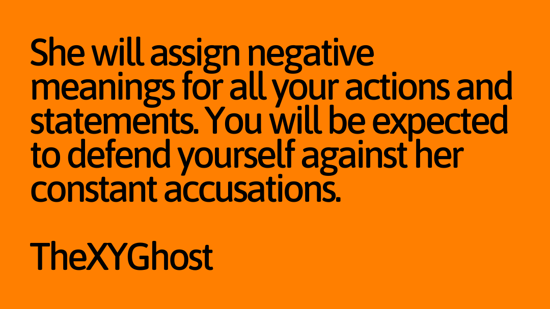 She will assign negative meanings for all your actions and statements. You will be expected to defend yourself against her constant accusations.