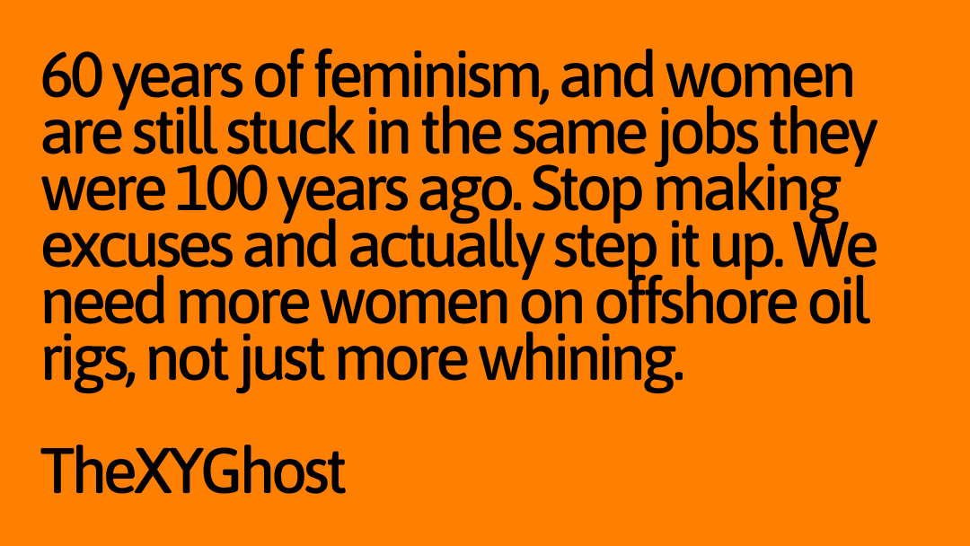60 years of feminism, and women are still stuck in the same jobs they were 100 years ago. Stop making excuses and actually step it up. We need more women on offshore oil rigs, not just more whining.