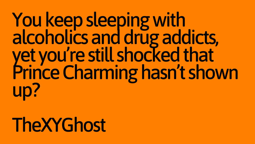 You keep sleeping with alcoholics and drug addicts, yet you're still shocked that Prince Charming hasn't shown up?