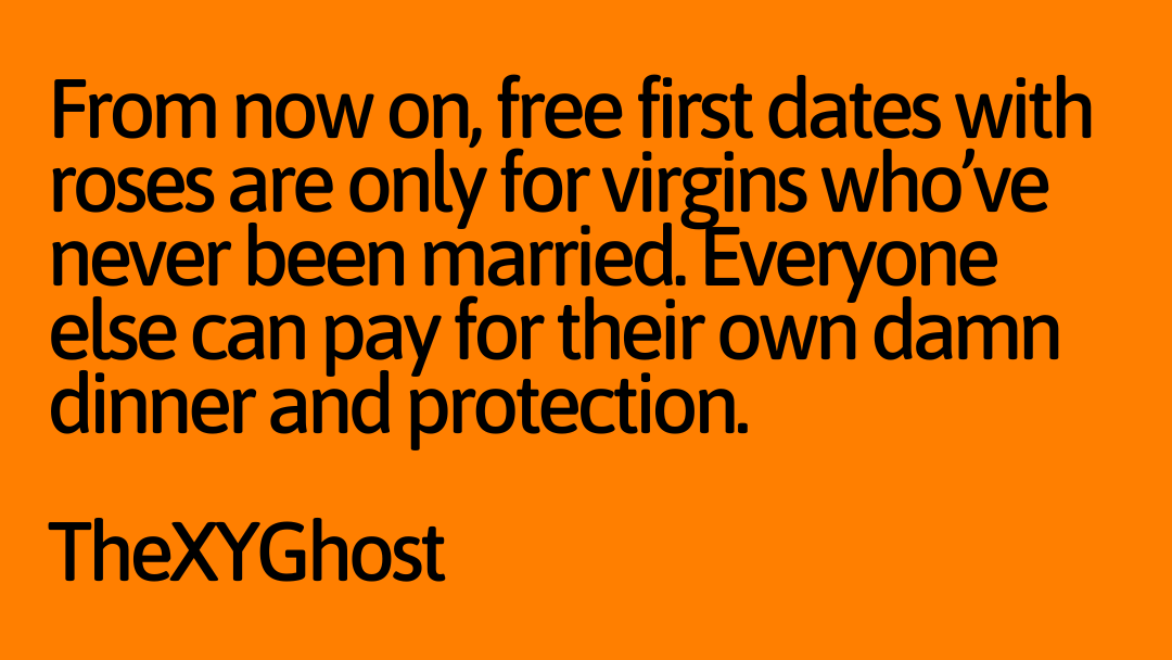 From now on, free first dates with roses are only for virgins who've never been married. Everyone else can pay for their own damn dinner and protection.